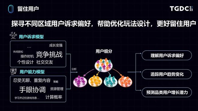 接下来,如何更好留住用户呢?这就需要依托我们对用户诉求和能力的理解和分析,基于团队内积累沉淀的用户诉求和能力模型,包括诉求侧的放松解压、竞争挑战、成长变强等标签,以及对于用户在抗压,操作,计算等游戏能力的评估等搭建分析。通过海外用户的细分等分析手段,可以更好的应用和指导业务。