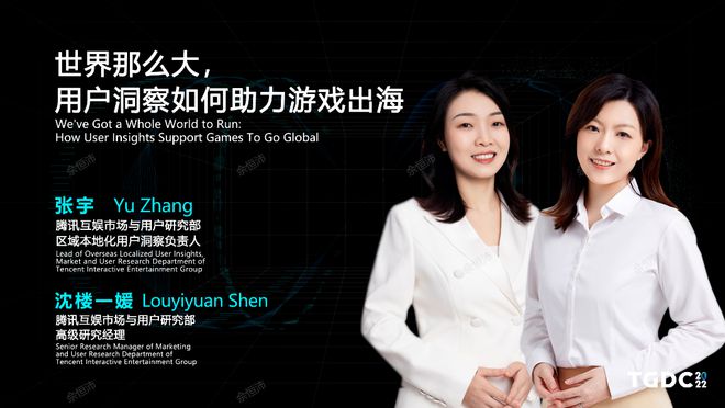 2022年8月15日,在第二天腾讯游戏学堂举办的TGDC腾讯游戏开发者大会,来自腾讯互娱市场与用户研究部的张宇和沈楼一媛,以“世界那么大,用户洞察如何助力游戏出海”为主题发表演讲,基于团队过往多年的海外积累,两位女士分享了海外新兴区域的发展潜力,拉动和留存用户的方法论,以及少数族裔人群、二次元人群、年轻代际人群三种细分人群的洞察等内容。