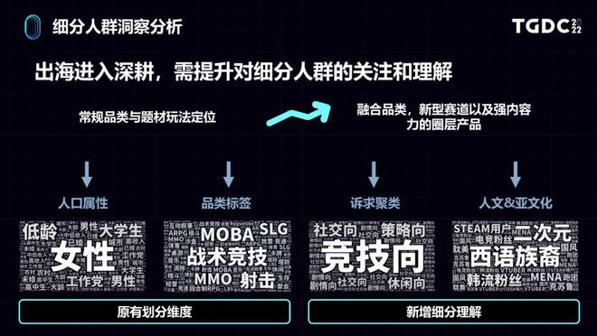 为什么要关注细分人群?这和游戏出海产业从粗放到精耕细作的趋势有关。过去五年是海外手游市场高速发展的时段,而未来五年,一方面手游红利依然存在、增速却趋于平缓,另一方面,随着更多厂商瞄准海外市场、出海竞争也将更为激烈。在这种背景下,对用户的理解需要进入深水区,精准找到目标,才能带来更高性价比。