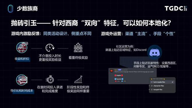 第一个是关于游戏内的激励反馈,对于同一种类型的活动设计,他们的偏好点、在意点是不是会有差别?还记得我们刚刚说的吗,西裔用户对线上社交的投入更重,对手游的态度更积极,同时更在意折扣。所以这会让他们在看待游戏活动的时候,对于活动周期的接受度范围是比较广泛的,如果有一个活动经过他们的计算性价比是比较高的,他们会比较愿意投入比较多时间、精力去完成这个任务获取奖励,也正因为这样,一个活动的终极奖励的品质、收益对他们来讲更重要。英语用户就会有一些不同,在同样意性价比的基础上,他们还会更在意时间成本,如果说有一个活动一开始就发现需要我事前承诺投入比较长的周期,或者有更大的完成难度才能够获取奖励,他们就会更加谨慎,正是因为这样,他们对于阶段性奖励也会非常在意,甚至能追上对于终极奖励的在意程度。这就是一个本地化的空间。