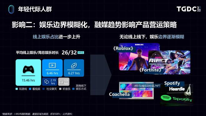首先整体而言,受到疫情以及触媒习惯的影响,年轻人们在线上投入的时间更多了,每周32个小时的娱乐时长甚至有26个小时都放在线上。同时这些媒介形式也在不断进行融合和合作,现在在游戏里面进行演唱会、舞蹈节这样的合作形式已经非常常见了,包括更新型的形式,比如说可编程的互动音乐视频也开始出现。