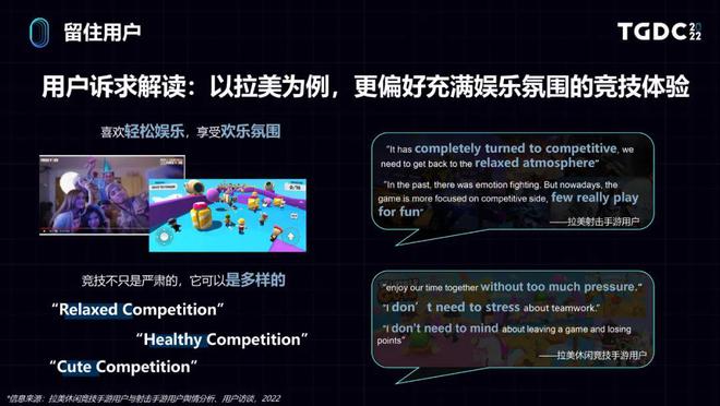 最后,我们看拉美市场,用户更加偏好竞技中也要有欢乐氛围,同时也有强烈的结果导向。既不想太严肃的参与对抗,但同时赢又是很重要的满足感来源,最好玩着玩着就能够赢了。