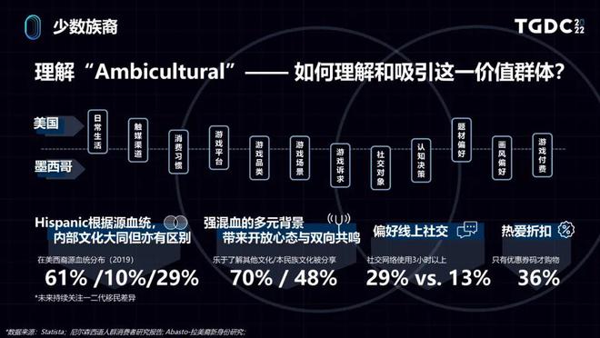 面对这样一群有比较丰富潜力的西裔用户,我们要怎么理解他们呢?一个重要的关键词是“Ambicultural”,这个词在英文当中特定那些可以在两种文化当中切换自如的人,西裔用户就是其中的代表之一。如果我们用一系列分析用户的指标去看他们的话,他们可以说是在美国和墨西哥之间“反复横跳”,在日常生活、触媒习惯上他们更接近美国的其他用户,但比如说在游戏的诉求、场景、社交的对象上,他们又会更接近墨西哥的用户。