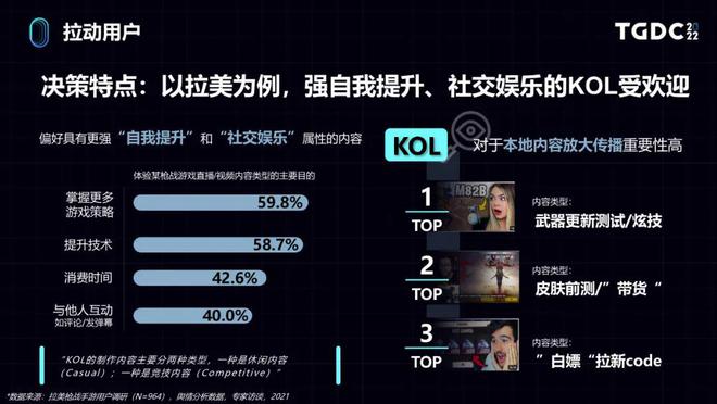 其次,出于实操目的,应该选择什么样的KOL以及内容导向呢?从用户诉求出发,拉美用户看KOL的主要目的有二,一是提高游戏水平,也就是自我提升诉求;二是跟他人互动,从而打发消磨时间,也就是社交娱乐向诉求。那反应到实际的内容中,可以看到,普遍有偏夸张、搞怪的视觉风格,来加强娱乐效果。具体内容而言,则有3类比较火:
