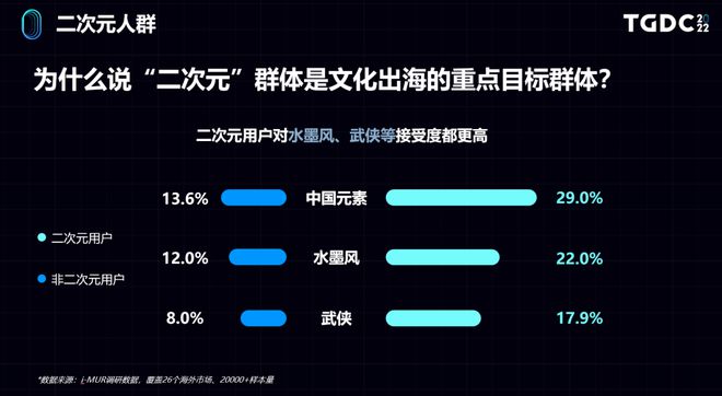 同时,从我们的调研数据再次证明了这个观点,可以看到在26个国家和区域的调研当中,用户无论是对于中国文化元素还是水墨画风的接受度还是武侠要素的欢迎程度上都比非二次元用户高出不少。
