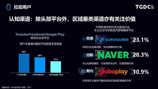 认知阶段-渠道:认知渠道方面,综合全球来看,传统平台,像youtube,facebook和谷歌商店依旧是TOP3头部渠道,在各个区域均有比较高的影响力,依旧是主流的发行阵地。但也有新的趋势出现,尤其伴随着买量成本的提升,在布局单区域市场时,一些地区媒体也值得关注。