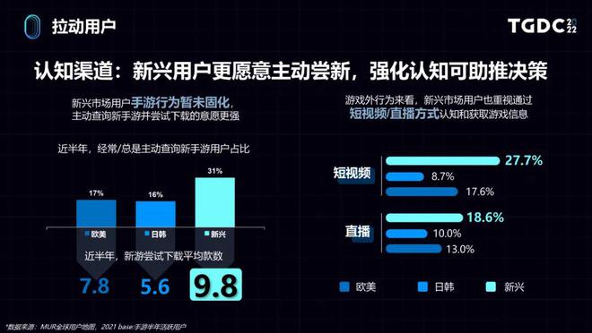 认知阶段:会发现不同区域用户的认知习惯差异还是比较明显的,首先在意愿上,新兴市场用户相比欧美日韩市场更主动,尝新意愿强,每半年会尝试下载近10款新游。这表明,他们从游戏认知到决策的链路较短,认知拉动下载的效果更好。因此,在新兴市场拉动用户时,强化产品认知会比较重要。那除了传统的应用商店,长视频网站和社交媒体外,还有更多丰富产品曝光点位的渠道嘛?