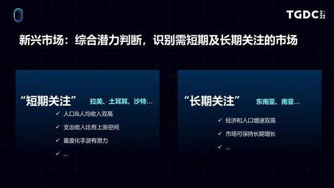 那有没有哪些市场是建议短期关注的呢?我们综合了很多当地用户的理解以及政策的解读等等视角,会建议短期关注一下拉美、土耳其和沙特市场,比如说沙特提出了2030年的愿景,更多政府侧会支持娱乐方向的投入利好信息。