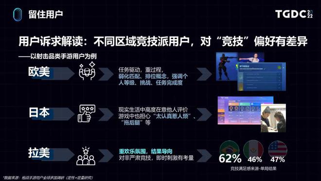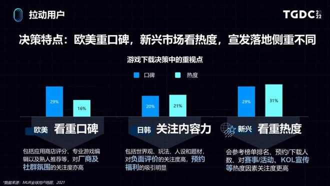 那接下来如果想要具体进入某个市场,需要更好的了解区域的特点, 我们选取了多区域横向对比的视角,以及两个关键方向和大家分享:首先,如何了解海外用户的认知和决策特点,从而针对性的吸引和拉动用户;其次,拉动用户后,如何结合诉求优化产品玩法设计,从而长期留住用户,维持产品生命力。
