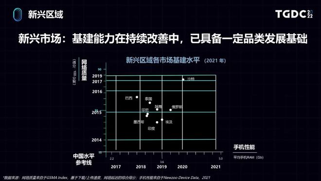 第一,基建能力。先来看一下不同的新兴市场,比如说拉美的巴西和墨西哥,带着一个历史的视角再来看一下它现在的基建相当于中国当时的什么水平。先来看一下以中国的参考线为例,手机的性能目前新兴市场大概是处于中国的2018、2019年的阶段;另外网络质量,新兴区域市场目前大概处于国内市场2016年的阶段,这个时候大家就可以理解,我们回想国内的2015、2016年发生了什么故事,那个时候重度手游在逐步崛起,2015 年之前重度游戏的渗透比例只有20%多,到了2017年其实已经上涨到了60%多。从很多视角分析,目前新兴市场已经具备一定的品类发展的基础。但是在这个时候业务出海也要更多基于当地用户的特征,注重基建能力的不断迭代和完善,注重小包体等。