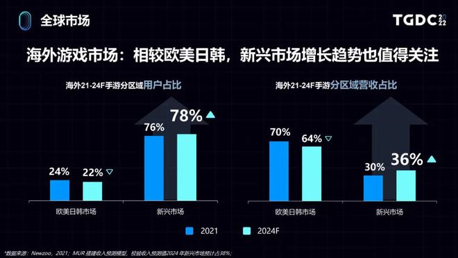 我们进入区域的视角进行解读,如果将海外的市场划分为两个方向,一个是欧美日韩市场,再者是新兴市场。从用户占比的表现来看,2021年的时候新兴市场用户量贡献了76%,从预测来看依然是上涨的趋势。从收入营收的角度来看,新兴市场在2021年的时候占比是30%,通过行业预测以及用研内部搭建的预测模型来看,预计在2024年能上涨到36%。行业内对于新兴市场也有更多的关注,希望听一下更多的潜力解读,我们带来了三个视角。