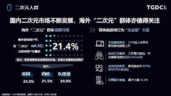 让我们先来厘清一下定义,这里讨论到的二次元定义还是比较传统的,是指那些经常消费日式动漫相关的作品、并且自认为是粉丝的用户,如果只有消费行为或自我认定不足是不算在这个范围内的。在这样的传统定义下,海外游戏用户当中有二次元标签的大概有6.3亿,占到总用户数的21%。并且并不仅仅是在一些我们熟知的第三世界市场比较风行,在欧美的发达国家同样能看到相当大的比例。