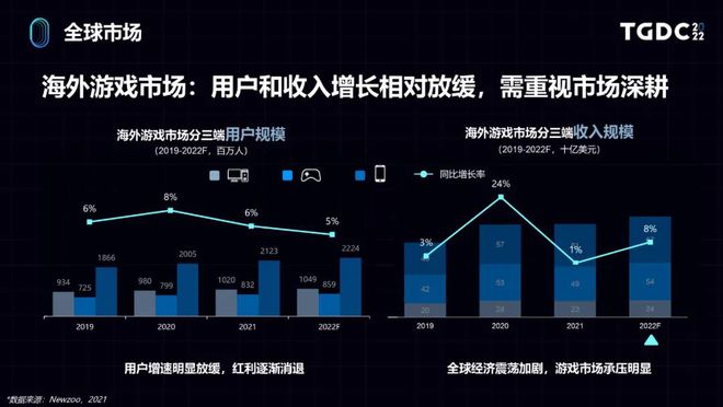 首先从整体看一下海外市场的情况:从去年开始,随着疫情红利消退,海外游戏市场的用户与营收增长均有所放缓。用户层面,人口红利逐渐消退,预计到今年底,用户增速将迎来连续第三年的下降;而营收层面也不乐观,出海进入到深耕阶段。