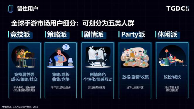 接下来带大家看一下基于2021年的分析。首先看一下全球游戏市场用户的细分可以划分为哪些类型,通过这个分析分为了五大类: