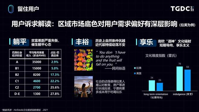 大家可能会疑问,为什么拉美用户会形成这样的凸显娱乐氛围的偏好,这个趋势是长期的还是一时的?以及在其他游戏诉求上是不是也和国内用户有较大差异?而想要系统性的回答这些问题,其实需要我们把区域洞察做深,看到更加底层的文化特点。还是以拉美为例,可以发现: