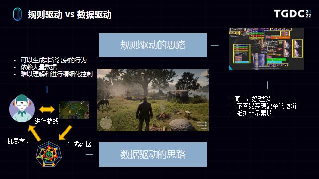 腾讯互娱研发效能部游戏AI技术总监殷俊就在“通往未来之路——基于机器学习技术实现游戏AI工业化的思考”分享指出,游戏的智能化应用不仅可以为玩家提供更生动的世界、更具挑战性的电脑对手,基于数据驱动的机器学习还能够将AI的行为设计得非常复杂,提高AI能力的上限。以格斗游戏为例,相比传统的人工行为树,机器学习可以塑造更风格化的AI动作逻辑,在性价比上也就更有优势。