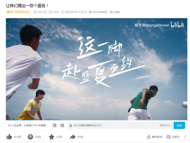 视频一经发布,即在B站累计收获了180w+的播放量、12w的点赞,位列B站全站热榜TOP 68并入选每周必看。同时,相关话题也在全网持续发酵,#橘子海回应这一脚踢出了整个盛夏#登上了微博热搜,话题挑战#一脚踢出整个盛夏#在抖音平台也收获了破亿的播放量。