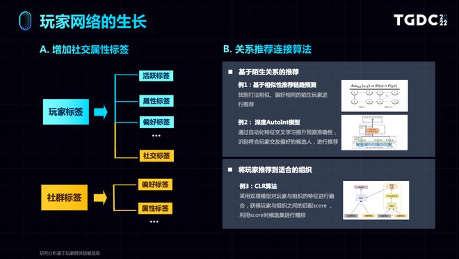 那有了这些标签,我们就可以从用户群体出发来做一些相应的体验优化了。首先我们关注的是玩家网络中的生长问题,玩家网络的生长就是网络中的如何建立新的连接关系,主要有两类:一类是陌生人之间进行交友建联,另外将玩家推荐建联到合适他的群体组织。