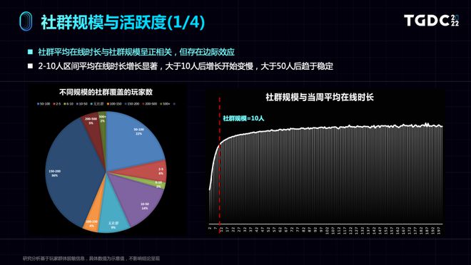 当我们去定义了这样一些划分标准的时候,就可以比较方便统计游戏中前面发现的社群里面各种规模的社群在其中占的数量有多少,同时我们也可以很方便地看到游戏中各类社群所能够覆盖到的玩家数量有多少,就如这张图的呈现。对于这张图,如果同比看一些周期,这里面的对比信息就会让你得到比较有启发的结论。