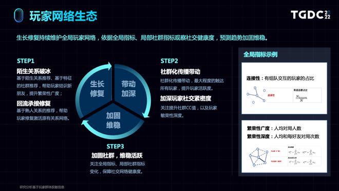 最后是在整个过程里,会不断地从对全局指标和局部指标的观察出发,来分析玩家网络波动的原因,同时也会开展一些主动的预测,去及时引导和加固相应的社群,维稳活跃。