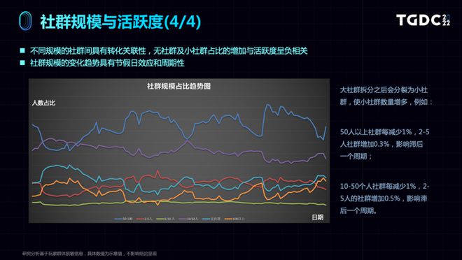 而如果我们把游戏里不同规模的社群人数占比随着时间画成一张图,我们也明显看到这种占比变化是存在周期性的,比如在每年春节这样的大节点,因为很多人有时间了,各种玩家的回流,大社群就会多起来,游戏里的社交就会呈现一种非常繁荣的迹象,当假期结束很多人重新忙碌起来,大社群就会拆分,小社群变得多起来。