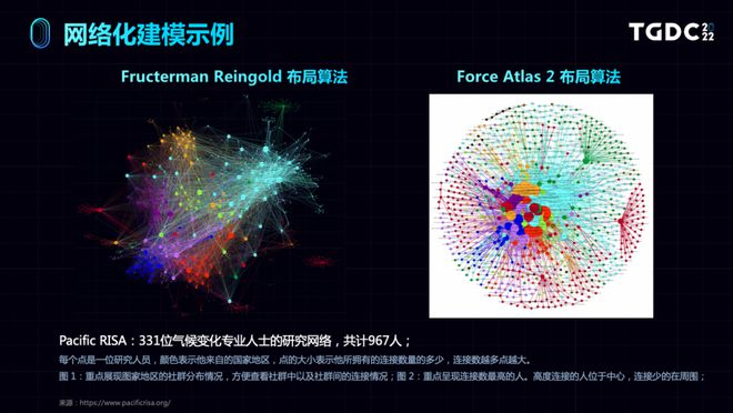 这里我们再展示一个更具体的示例。这两幅图来源于 Pacific RISA的网站,这个网站是评估太平洋区域海岛气候环境变化的一个研究项目。这个研究组织对所有参与研究的331位专业人士的研究关系网络进行了调查和绘制,当把所有与这300多位研究人员有进行过气候相关交流讨论的人员也包含进来以后,最后绘制成了一个有967人的研究关系网络。最后他们在网站上公布了绘制出来的两幅图,就是大家在这里看到的两幅图。这两幅图分别采用了不同的布局算法来呈现。图上的每种色彩,标识的是研究人员来自的国家和地区,而圆圈的大小用来表示每个人所拥有的连接数量。