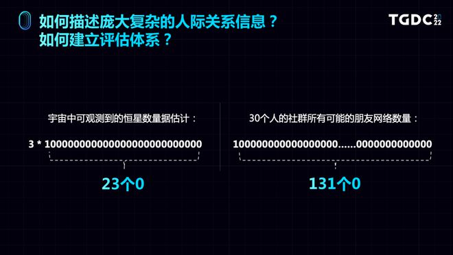 参照这两个图,大家其实可以感受到,如果我们把游戏里的玩家网络绘制出来,那也将是这样的一种图示的方式,只不过对于数量以亿计的玩家数来说,如果我们把玩家的连接网络可以在计算机里绘制出来,但如果把它导出来很难让人以肉眼的方式来查看和了解信息,因为这基本上已经超出了人通过肉眼处理信息的能力。但是计算机是有这样的信息阅读和挖掘能力的,所以我们可以通过计算机运用多种算法来从不同维度帮助我们透视了解其中的信息。