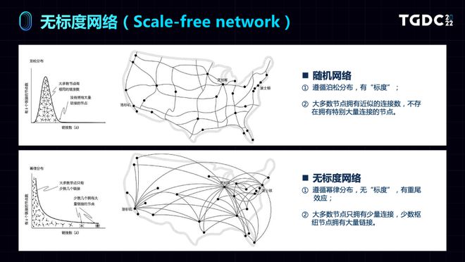 首先对于公路网来说,可以看到它显著的特点是:无论是大城市还是小村庄,一般拥有的公路数量差别都不大,大概在3~5条上下这样一个范围。这种网络我们称之为随机网络,这个网络的特点是每个节点拥有的连接数大体是差不多的,没有拥有特别多连接数的节点,整体是遵循泊松分布,而我们所说的差不多其实就是“标度”;而对于航空网就非常不一样了,比如就从这个示意图看,像芝加哥这样的大枢纽城市会拥有非常多的航班线路,而小城市的航线就非常有限。对于这种大多数节点只拥有少量连接,而少数节点却拥有大量连接的网络,叫把它叫做无标度网络,它整体是遵循幂律分布的,这个分布的尾部会拖的比较长,所以我们说它是有重尾效应的。