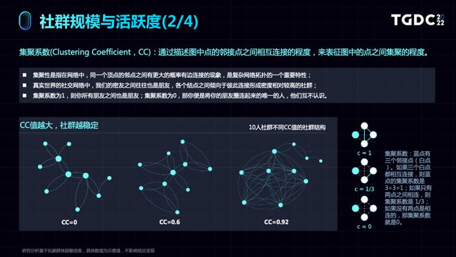 为了进一步研究清楚社群规模和用户活跃度之间的关系,我们又进行了进一步的探索。这里我们要引入图论中的集聚系数的概念,简称cc值,方便描述。关于cc值的具体概念可以看右下方的示例,但是为了方便大家记住结论,我们用一种更简单的方式来介绍它。