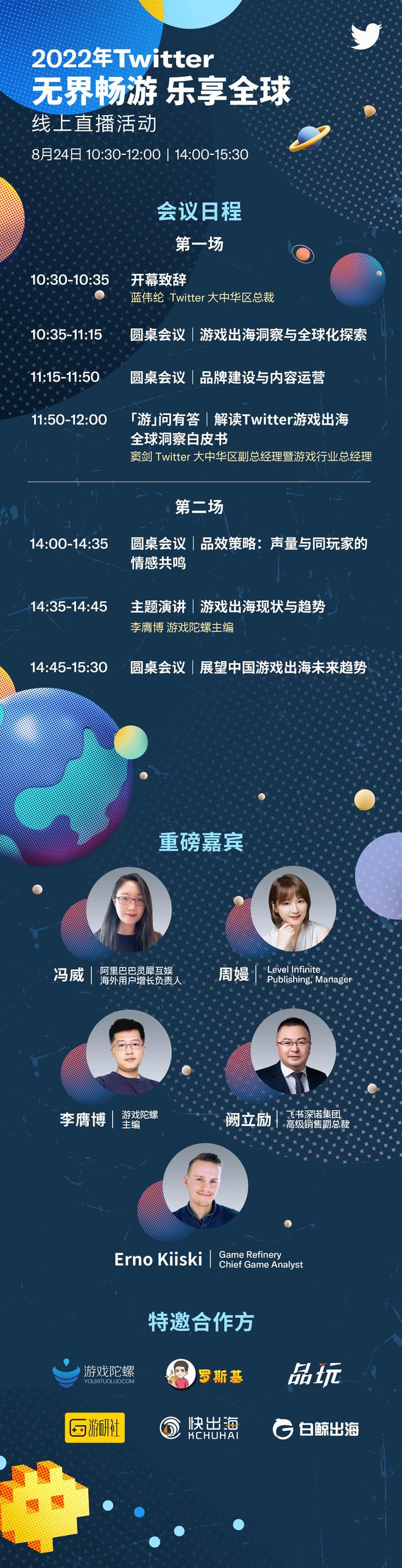 在机遇与挑战并存的出海大环境下,中国游戏在全球市场的拓展具体面临哪些情况?又有哪些值得借鉴的先进经验?本次Twitter直播活动上,四位重磅嘉宾——Level Infinite Publishing Manager周嫚、Game Refinery Chief Game Analyst Erno Kiiski、Twitter全球游戏内容合作总监Rishi Chadha,以及Twitter大中华区商业营销负责人魏嘉,将率先围绕“游戏出海洞察与全球化探索”进行充分讨论,游戏陀螺主编李膺博也将以“游戏出海现状与趋势”为主题进行演讲分享。