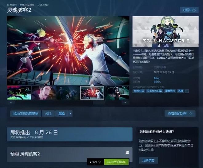 ATLUS旗下新作《灵魂骇客2》将于8月26日正式上线,目前该游戏已经上架Steam平台,国区标准版展示价格为379元,还是不便宜的。