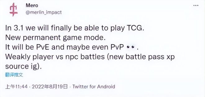 与此同时,一位专注于挖掘《原神》数据的用户“merlin_impact”爆料称,《原神》计划在未来添加新的永久游戏模式,具体内容是一种TCG卡牌游戏。
