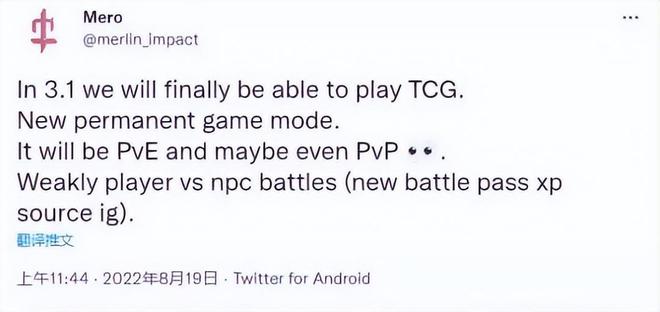 与此同时,一位专注于挖掘《原神》数据的用户“merlin_impact”爆料称,《原神》计划在未来添加新的永久游戏模式,具体内容是一种TCG卡牌游戏。