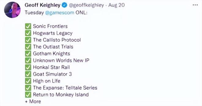 目前,科隆游戏展已经公布了开幕夜亮相的游戏,其中包括《霍格沃茨遗产》《原神》《崩坏:星穹铁道》《模拟山羊3》《逃生:试炼》以及大量的微软旗下第一方作品。