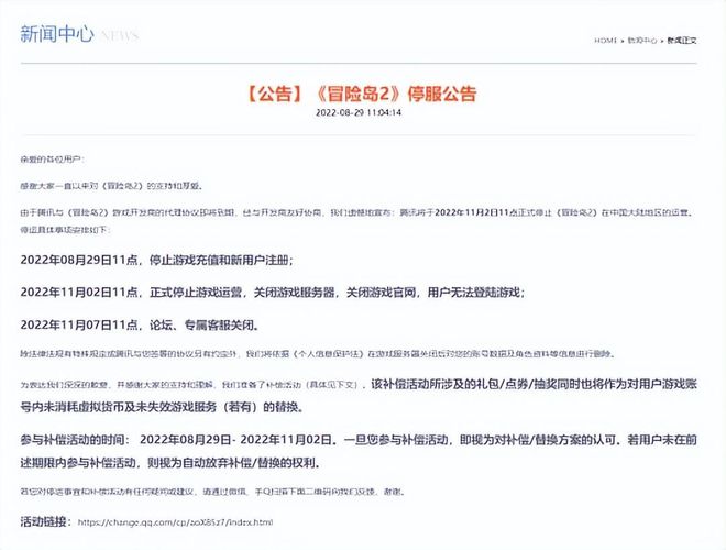 2022 年 11 月 02 日 11 点,正式停止游戏运营,关闭游戏服务器,关闭游戏官网,用户无法登陆游戏;