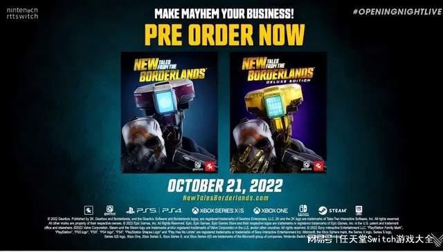 在之前各种提前爆料之后,科隆游戏展开幕之夜上《无主之地新传说》正式公布,游戏将于10月21日登陆PS4|5、XSS|X、Xbox One、Switch以及PC平台。