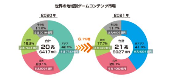 书中数据显示,2021年全球游戏内容市场规模为218927亿日元(10946.35亿元人民币),同比增长6%。其中欧美市场增幅较明显,而东亚市场基本与前一年持平。