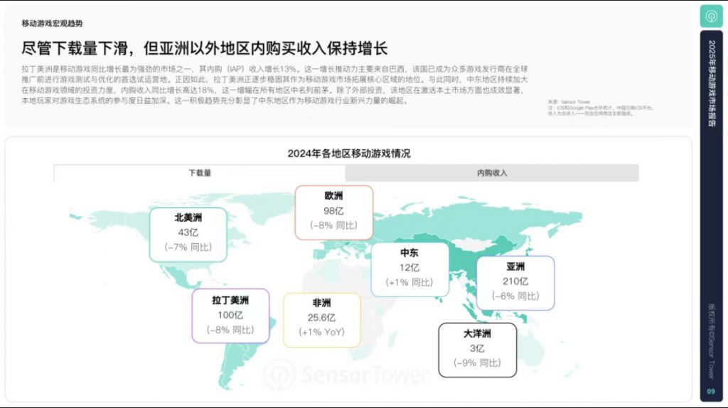 📈 2024年,移动游戏内购收入同比增长4%,使用时长激增8%,会话次数更是跃升12%。尽管下载量有所下滑,但开发者重新聚焦现有游戏的实时运营,成功实现增长。