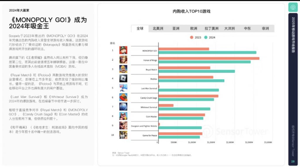 🏆 《MONOPOLY GO!》凭借全球最高的内购收入,成为2024年的最大赢家。这款由Scopely于2023年推出的游戏,将经典的《Monopoly》IP与热门的金币掠夺玩法巧妙结合,赢得了广大玩家的喜爱。《王者荣耀》稳居第二,仍是全球最大的中度核心游戏。