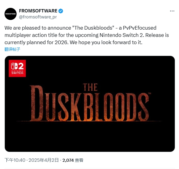 FromSoftware新作《The Dusk Bloods》正式公布,游戏为Switch 2独占。导演宫崎英高详细介绍新作品的“创造者之声”将于4月4日在任天堂官方网站公开。