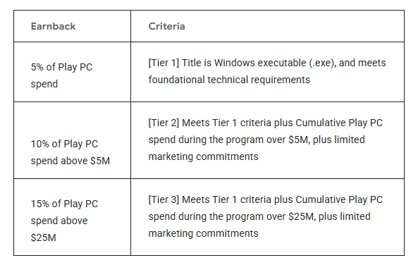 游戏新闻还需要提醒的是,Google Play Games的15%返利并不是针对所有游戏。据官网信息显示,返利计划共分为3个层级,所有PC版本都可以获得5%的玩家PC消费返还,消费金额超过500万美元的游戏可以获得10%的返利,PC版本超过2500万美元收入则可以获得15%返利。