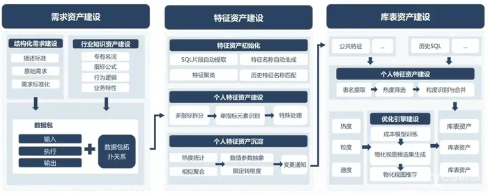 - 人工构建则是基于公共特征资产及其热度、粒度、速度参数,由优化引擎推荐数仓模型设计,然后人工根据建议构建库表资产。