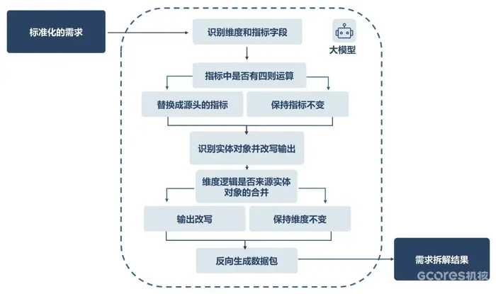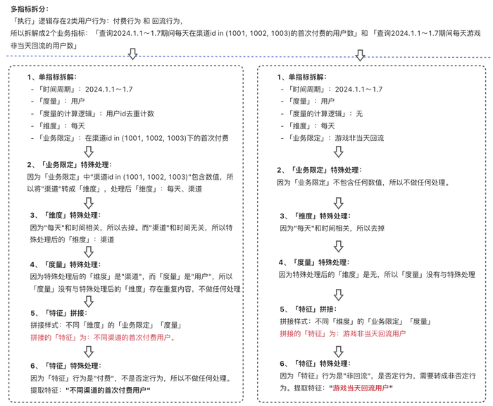 - 维度和指标解析:大模型首先识别维度字段和指标字段。针对四则运算的复合指标(入“付费渗透率”),需改写为原始计算指标并保持维度不变。