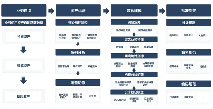 传统数据资产建设核心围绕「标准化、建模、运营、自助化」四个环节展开,旨在通过规范化流程提升数据质量和复用效率。