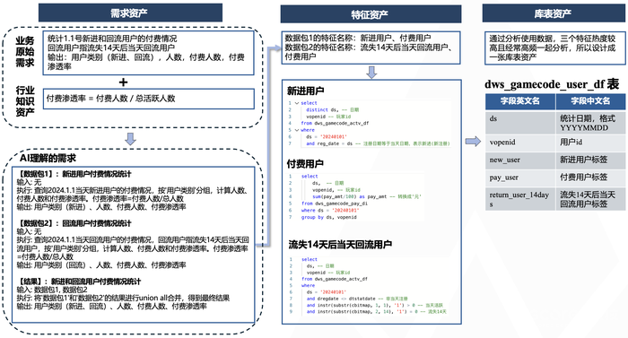 特征资产由特征名称和SQL片段构成。其中特征名称由大模型自动提取,SQL片段则通过资产库匹配或人工补充完成。以”统计特定渠道首次付费用户中的非回流用户数”需求为例,特征名称提取流程为: