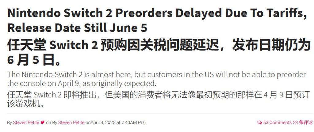 巧合的是,就在4月2日当天,任天堂还举行了Switch 2专场直面会,会上确认将于4月9日开启全球预售。然而正是因为美国关税政策的影响,任天堂又在直面会结束以后宣布推迟Switch 2在美国市场的预购计划。