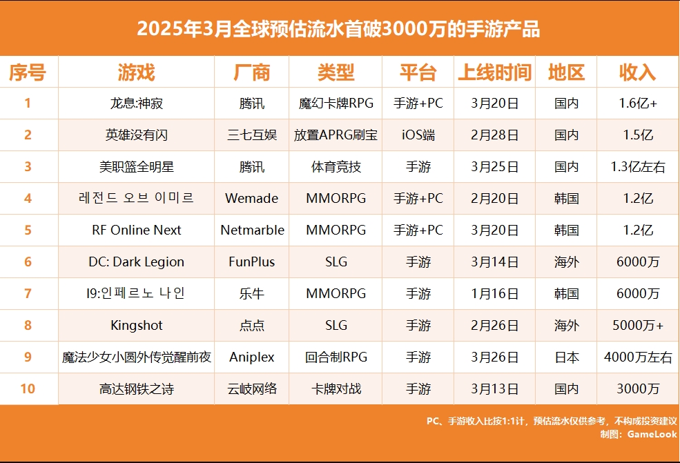 3月表现最亮眼的游戏分别是:腾讯《龙息:神寂》、三七互娱《英雄没有闪》、腾讯《美职篮全明星》、Wemade《레전드 오브 이미르(尤弥尔传奇)》、Netmarble《RF Online Next》、FunPlus《DC: Dark Legion》、乐牛《I9:인페르노 나인》、点点《Kingshot》、Aniplex《魔法少女小圆外传觉醒前夜》、云岐网络《高达钢铁之诗》。