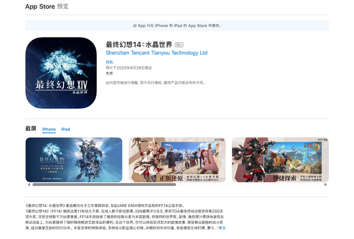 据AppStore消息,《最终幻想14:水晶世界》预计于2025年8月29日推出。