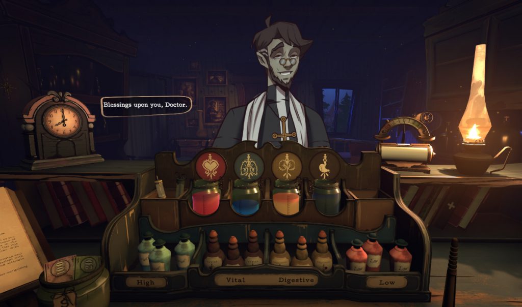 到了2024年6月的Baku Game Summit峰会,游戏的重点是根据病人给你的症状进行推演,并在“Book of Medicine”中梳理治疗方法。与当前版本最大的不同是,如果你足够仔细地寻找,你总能在书中找到正确的答案,而现在你必须冒一些风险,在不完美的信息下工作,洛夫克拉夫特元素也几乎不存在。