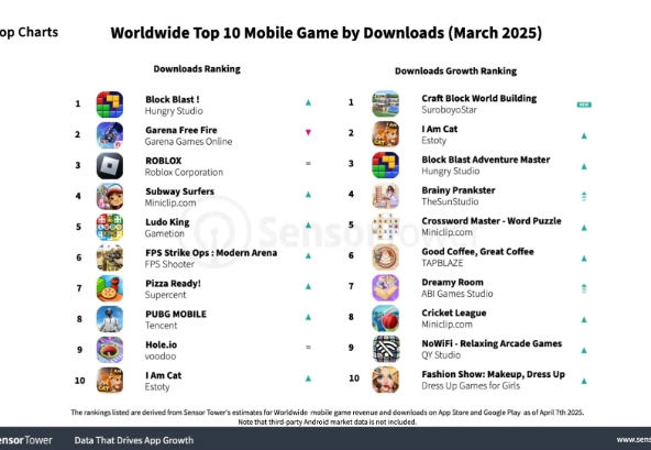 Sensor Tower应用洞察数据显示,《Block Blast!》在2025年3月成为全球下载量最高的手游,较上月上升一位。自2022年3月发布以来,该游戏累计下载量已达4.55亿次,在美国、印度与印尼等核心市场表现尤为强劲,凭借上手简单的益智玩法与高留存策略,持续吸引新用户。